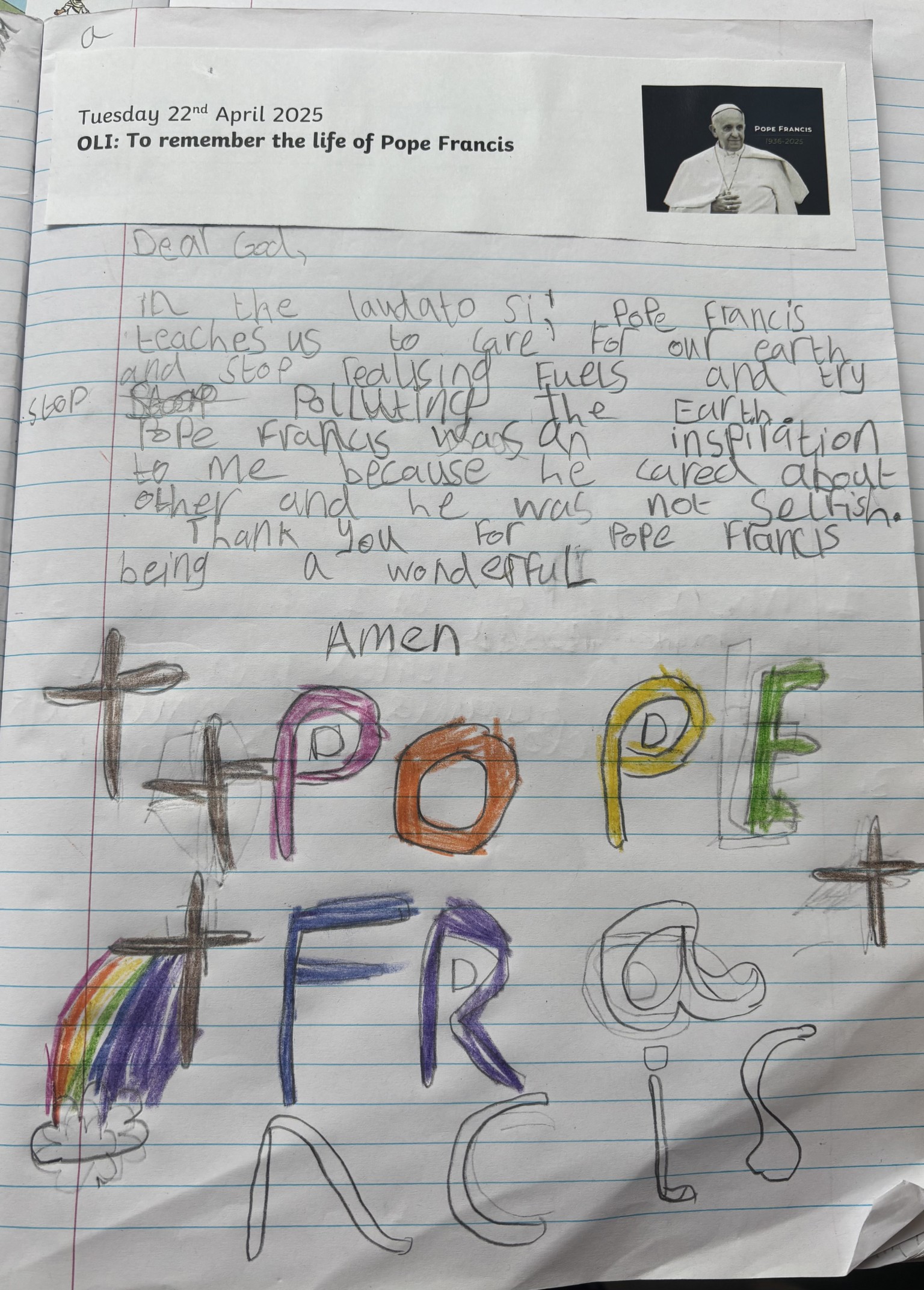 As a Catholic school community, we are taking time to reflect on his life, his leadership, and his message. Pope Francis was a man of great humility and compassion, who reminded us all of the importance of kindness, care for creation, and standing up for those in need. He often spoke about mercy, about walking alongside others, and about putting love into action — values that are at the heart of who we are as a school.